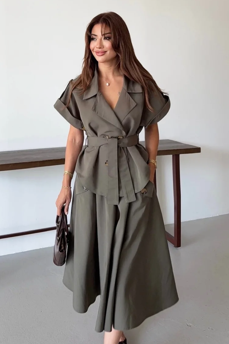 - A felső rész vonzó dizájnnal és gombokkal van ellátva teljes hosszában, övvel.