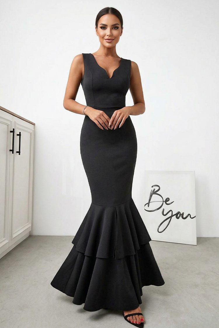 - A modell sellő szabású, elegáns fodrok, testhezálló szabású, V dekoltázzsal és fekete színben.