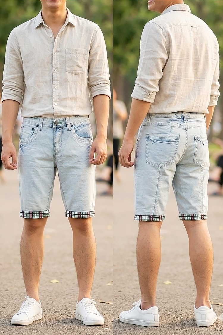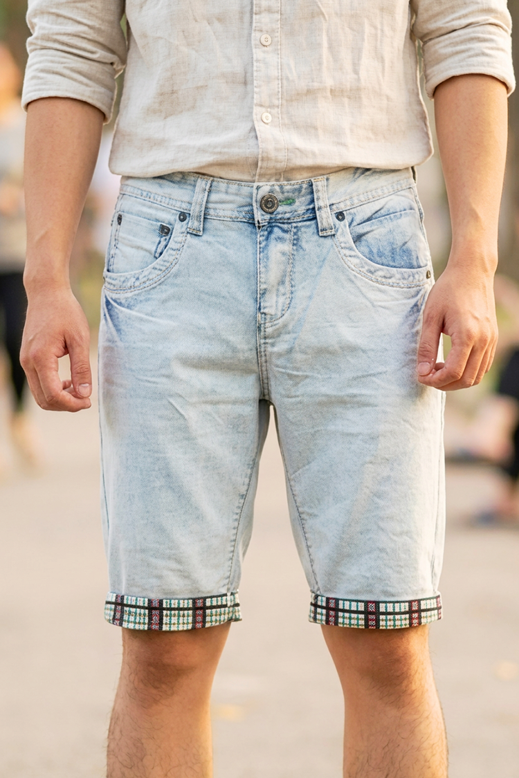 - Letisztult, világoskék férfi farmer rövidnadrág, amely különféle divatkombinációkhoz illik.