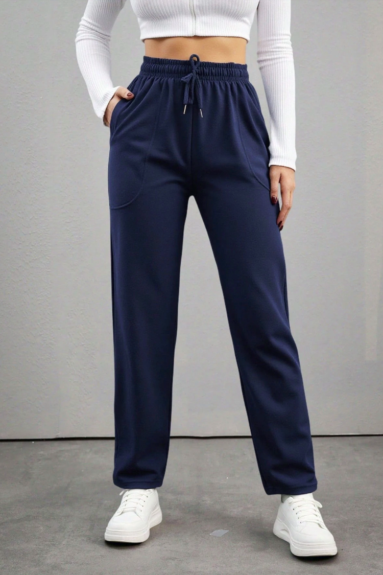 - A modell magas és rugalmas derékkal, megkötővel, oldalsó zsebekkel és sötétkék színben kapható.