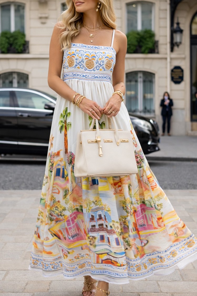 - A ruha kényelmes és bő szabású, vékony pántokkal, rugalmas derékkal, vonzó nyári mintával és oldalsó zsebekkel rendelkezik.