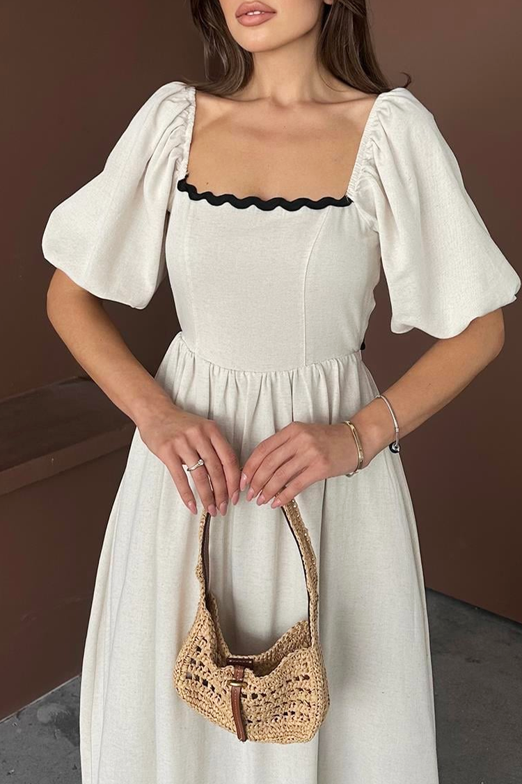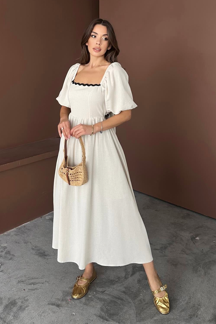 - A ruha midi hosszúságú, divatos sziluettű, szögletes nyakkivágású, rövid puffos ujjú, fekete részletekkel és hátul megkötővel rendelkezik.