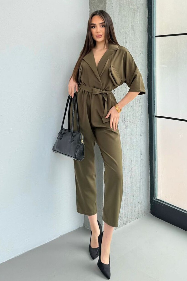 - A modell divatos dizájnnal, elegáns gallérral, khaki színben, oldalsó zsebekkel, rövid ujjakkal és ugyanabból az anyagból készült övvel rendelkezik.