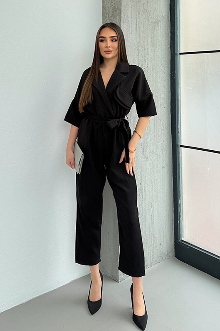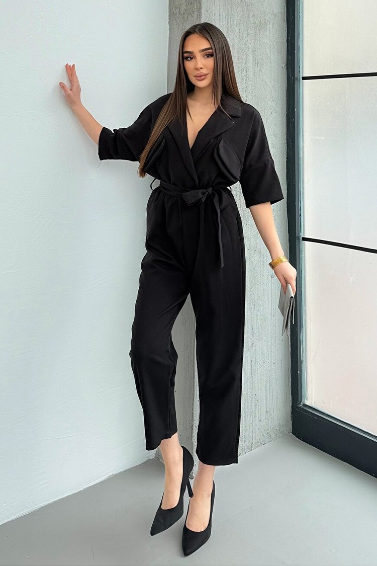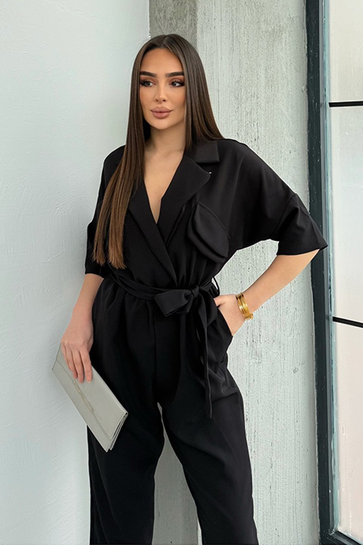 - A modell divatos dizájnnal, elegáns gallérral, fekete színben, oldalsó zsebekkel, rövid ujjakkal és ugyanabból az anyagból készült övvel rendelkezik.