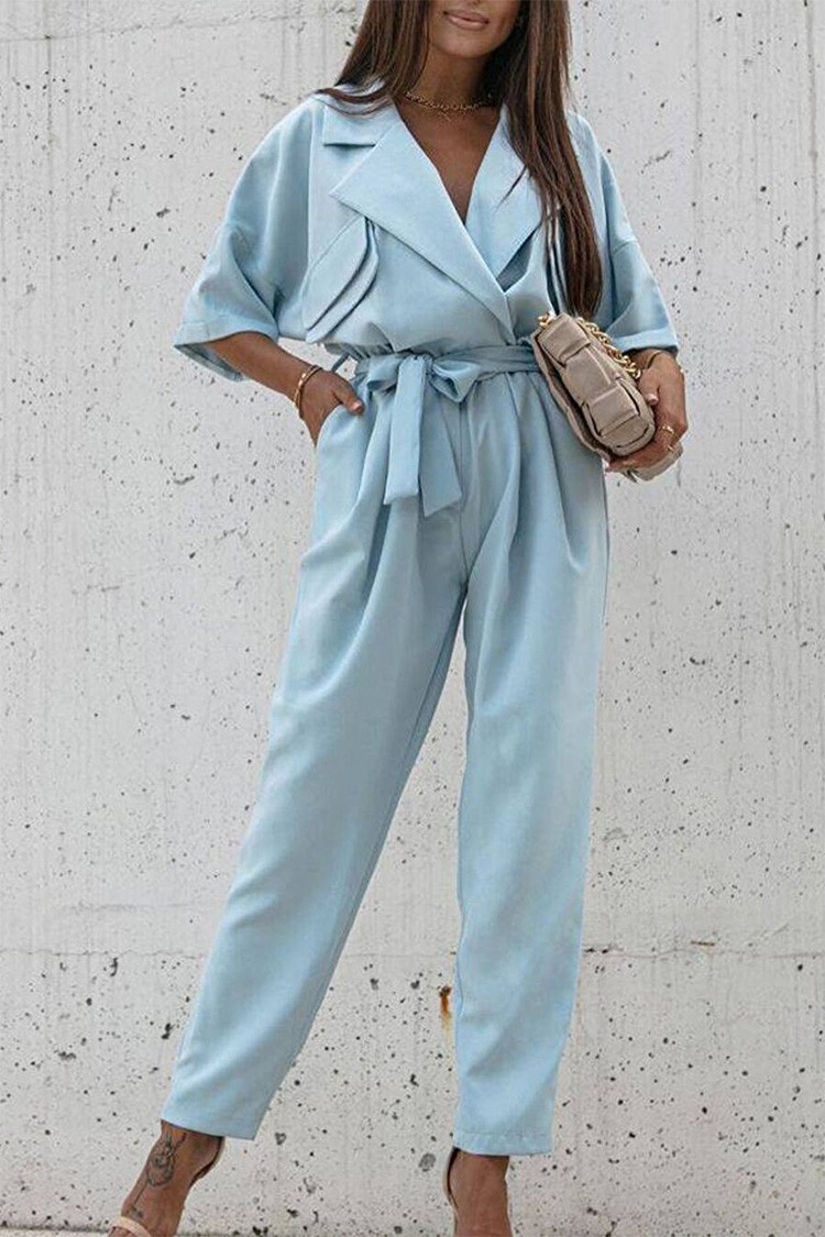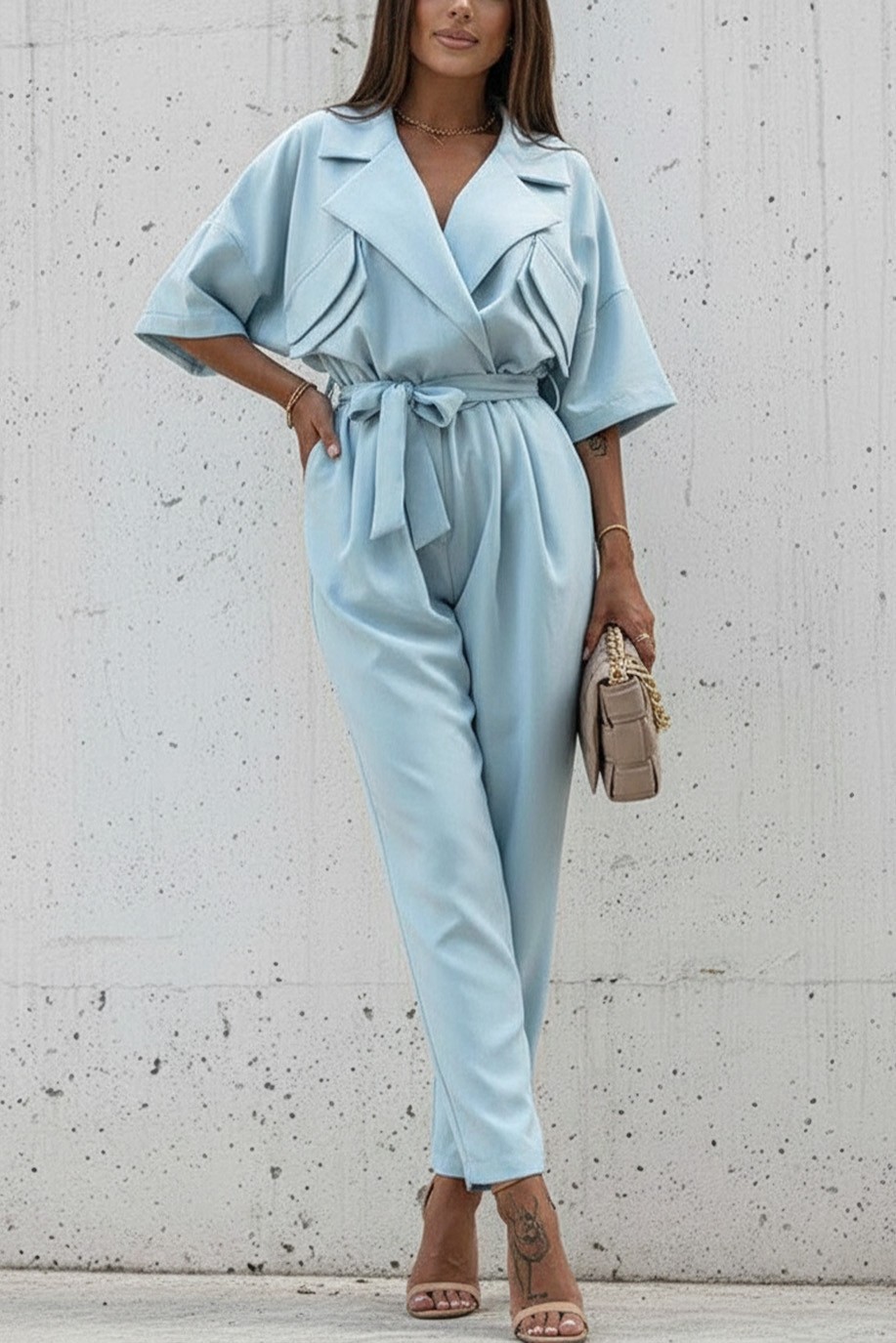 - A modell divatos dizájnnal, elegáns gallérral, világoskék színben, oldalsó zsebekkel, rövid ujjakkal és ugyanabból az anyagból készült övvel rendelkezik.