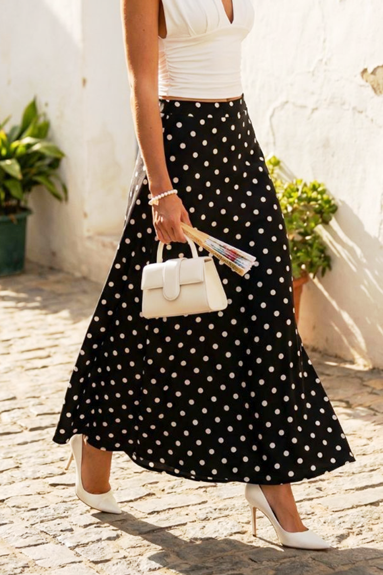 - A modell bő szabású, középmagas derekú, pöttyös mintás és fekete színű.