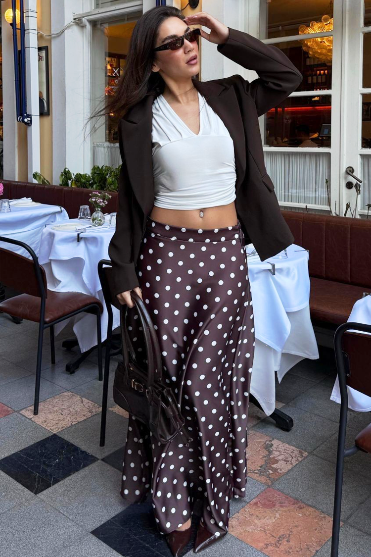 - A modell bő szabású, középmagas derekú, pöttyös mintás és barna színű.