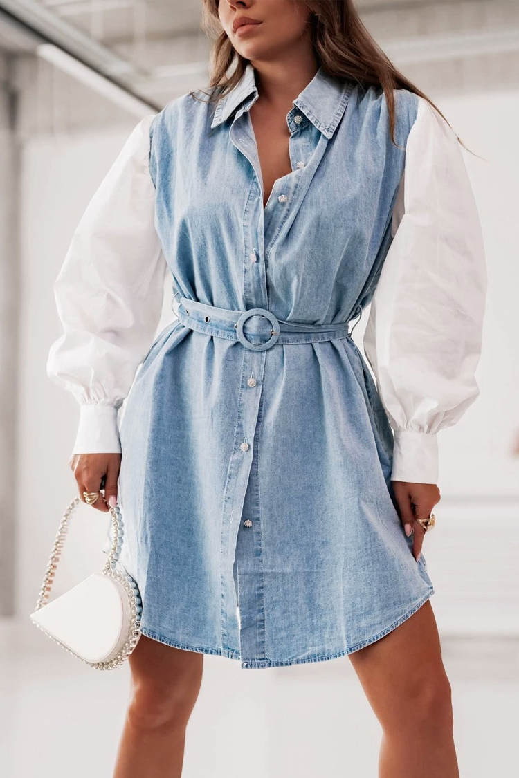 A modell világos farmerárnyalatból készült, és fehér, puffos ujjakkal tűnik ki, amelyek kifinomult és emlékezetes kiegészítőt adnak. Klasszikus gallérral és gombos rögzítéssel a teljes hosszában. A derekat ugyanolyan mintázatú öv hangsúlyozza, amely gyönyörűen formálja az alakot. A rövid fazon és a kissé bő szabás kényelmet és nőies megjelenést garantál, így a ruha nagyszerű választás mind a mindennapokra, mind a különlegesebb alkalmakra.