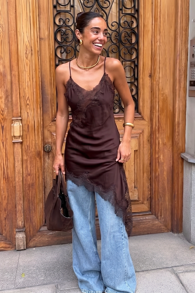 Az aszimmetrikus szabás modern és jellegzetes karaktert kölcsönöz, míg a finom csipkerészletek és a merész hasíték romantikus és csábító hatást keltenek. A V-nyakú kivágás gyönyörűen hangsúlyozza a kebleket, a vékony pántok pedig letisztult és kifinomult sziluettet adnak.