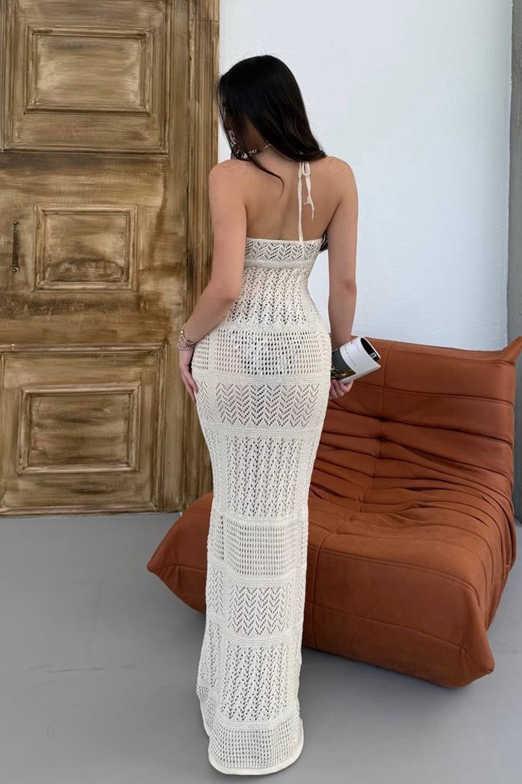 KLEOPATRA ECRU hosszú, kötött strandruha nyitott háttal