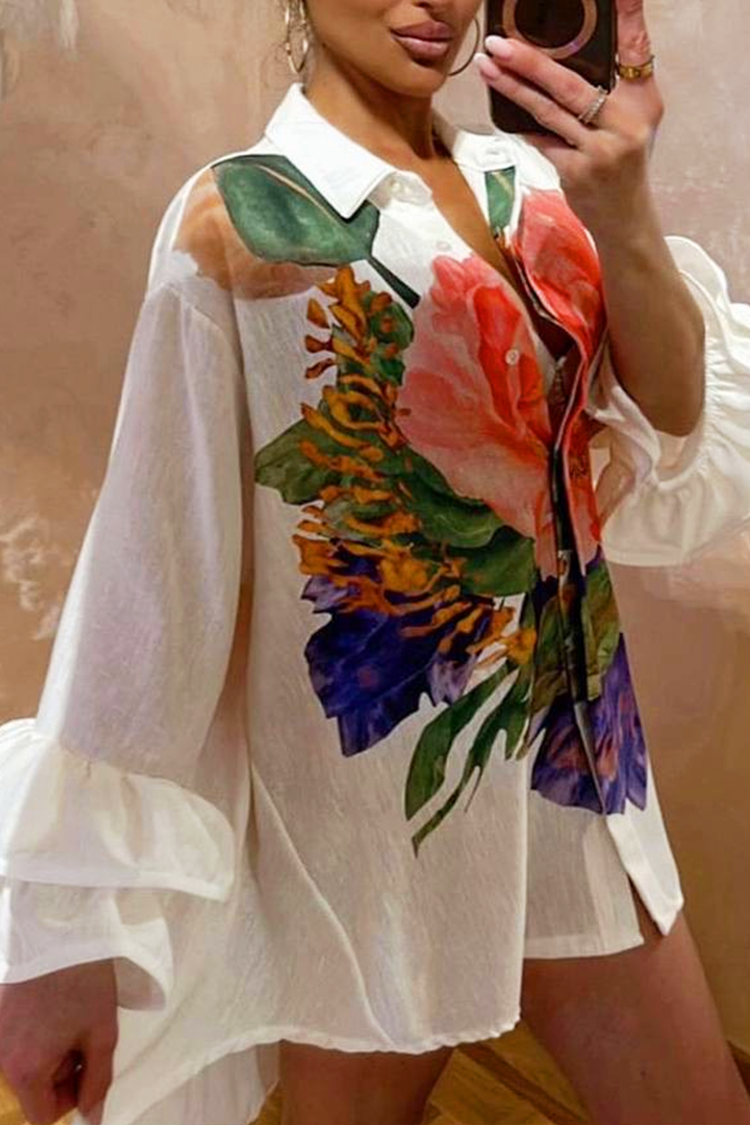 Stílusos, aszimmetrikus női blúz látványos virágmintával, amely ötvözi az eleganciát, a kényelmet és a modern megjelenést. A modell lenyűgöző dupla fodros díszítéssel rendelkezik az ujjakon, amelyek nőiességet és lendületet kölcsönöznek, míg a bő szabás könnyedséget és kényelmet biztosít egész nap.