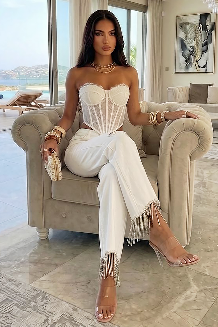 Az igazi fénypont a szárak alján található finom rojt - egy finom, de nagyon hatásos elem, amely kiemeli a bokákat és luxusérzetet teremt. A térdnél lévő enyhe slip modern érintést és kontrasztot ad az elegáns megjelenésnek.