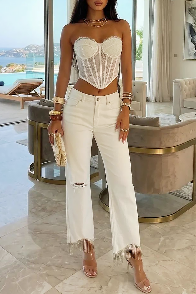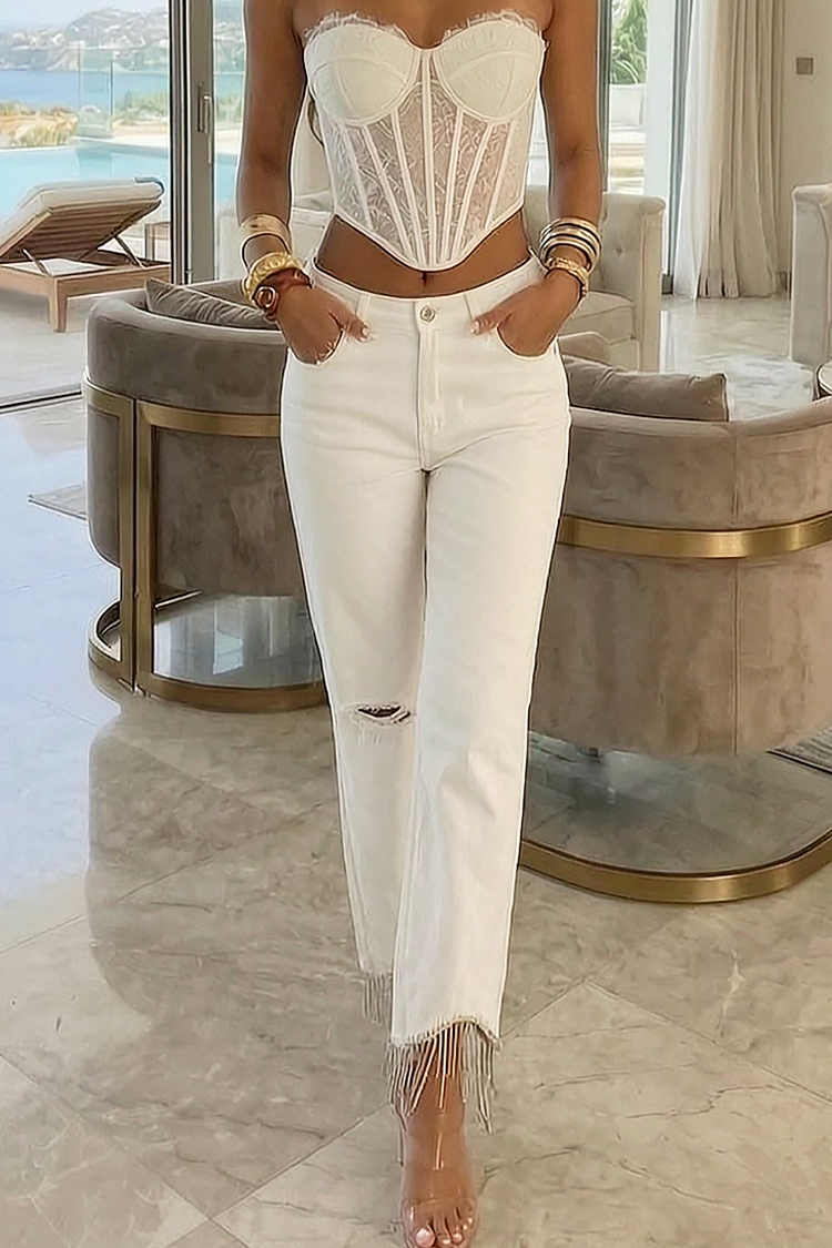 LURISA női fehér farmer rojtokkal, szakadt részekkel