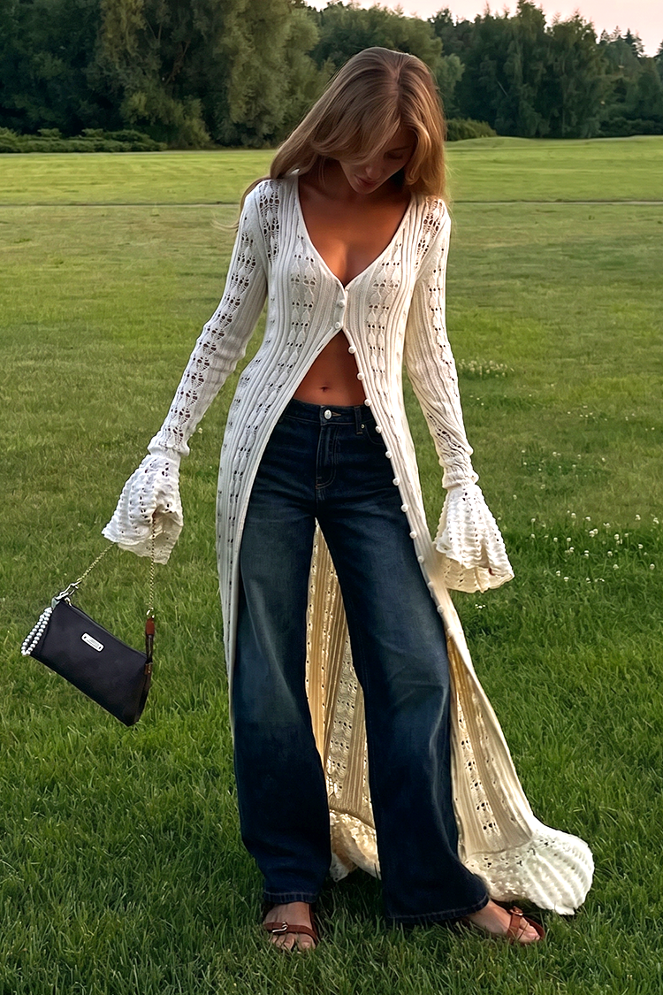 Stílusos és sokoldalú kötött kardigán, amely önmagában és könnyű felsőruházatként is viselhető.