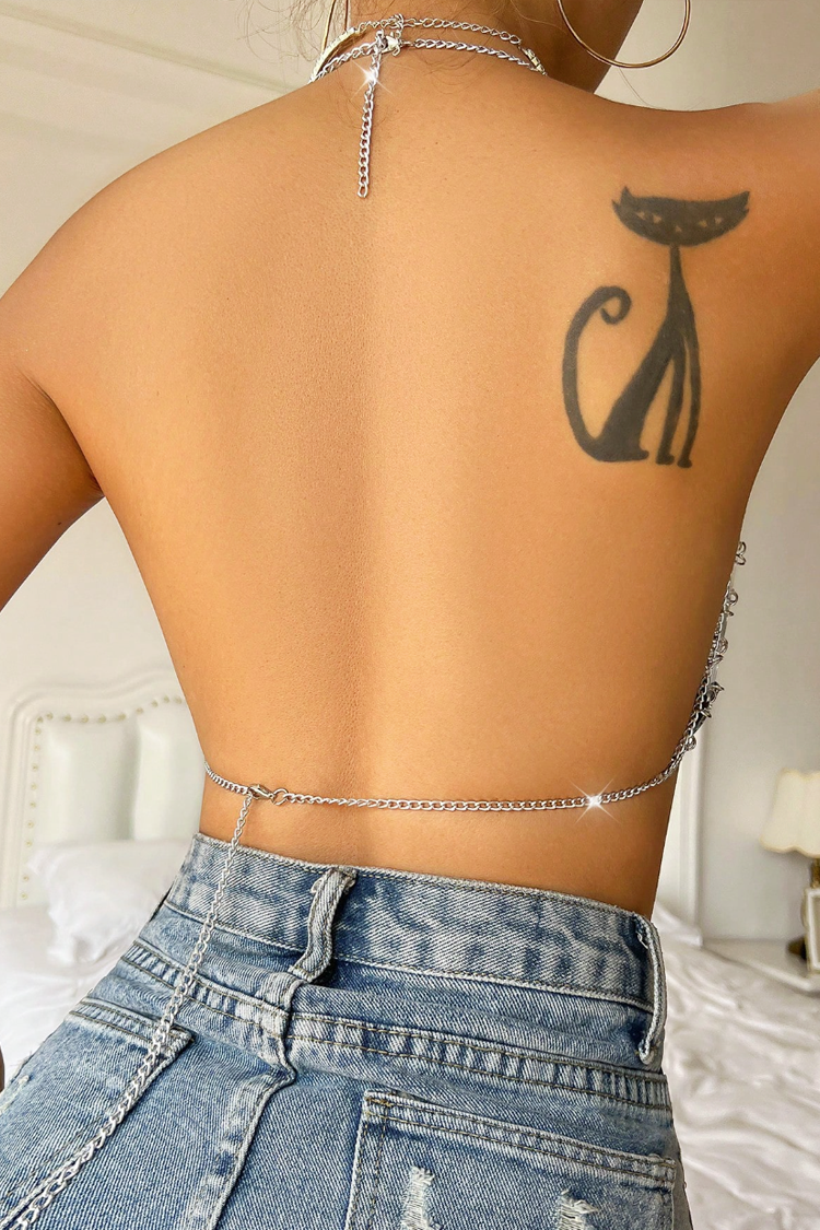 A háromszög alakú fazon formálja és hangsúlyozza a mellet, a finom láncok pedig finom kontúrt rajzolnak ki a test körül. A mély, elbüvölő dekoltázs segít maximalizálni a csábító ragyogást.