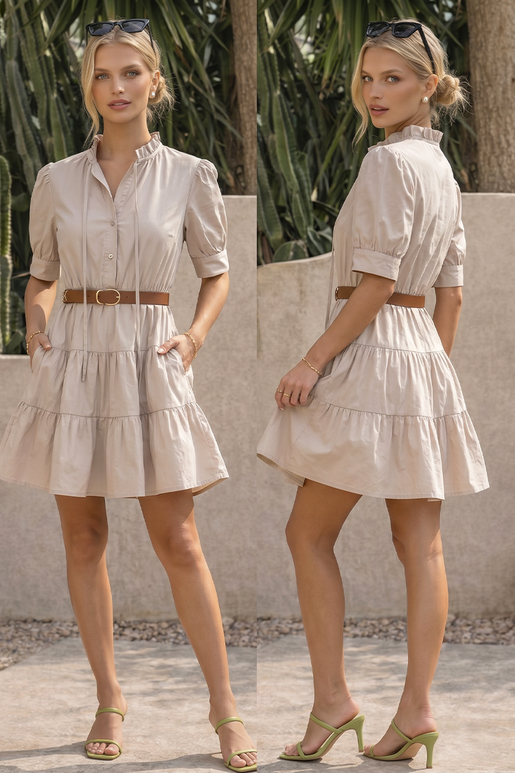 AXIMENA BEIGE rövid, bő ruha látványos fodorral